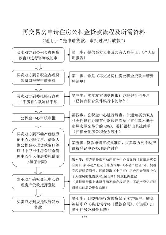 为进一步规范我市住房公积金贷款办理流程,有效化解借款人二手房交易风险,2021年8月30日中卫市住房公积金管理委员会印发了《关于调整规范部分住房公积金使用政策的通知》(卫房金管委规发〔2021〕1号),明确了调整优化再交易住房贷款流程,即自2021年10月8日起对购买再交易自住住房申请住房公积金贷款的由原来执行的“先办理房产过户、再提交贷款申请资料,符合贷款的予以放款”修改为“先受理贷款申请,对符合贷款条件的通知当事人办理房产过户,最后办理放款手续”办理新流程。